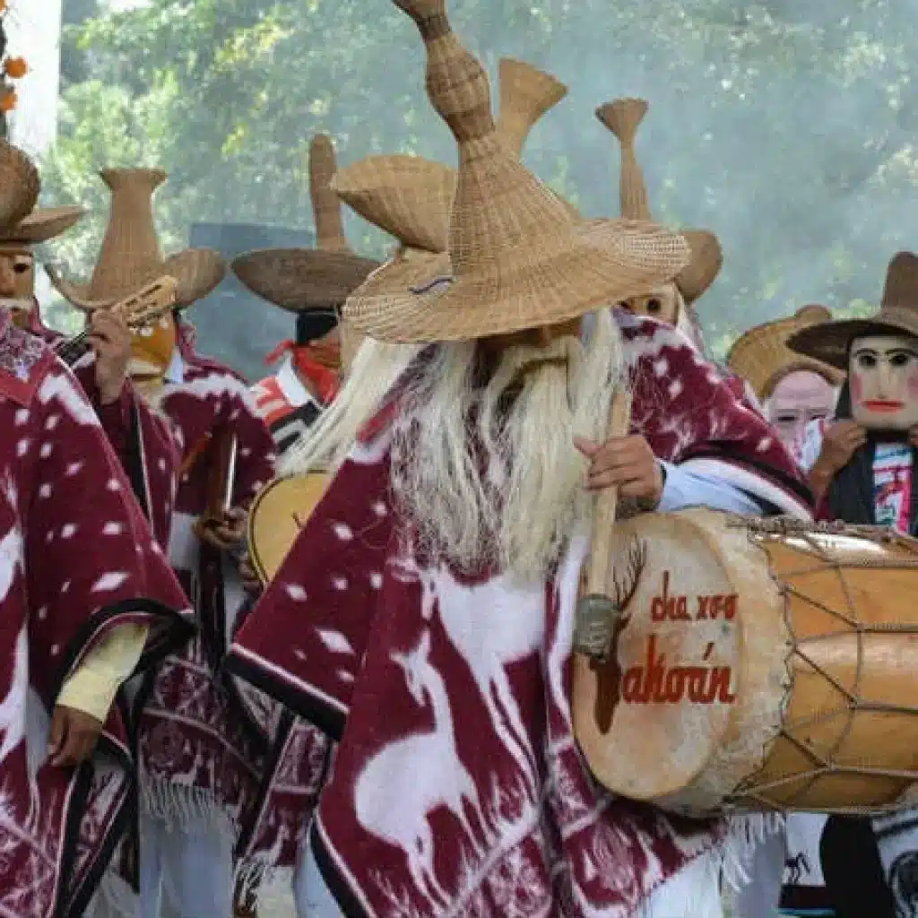 The most fascinating part of this celebration is a special group of people that carry a huge responsibility rooted in their uses, customs, and beliefs, called “Huehuentones” who have to go through many years of special training to be able to do this unique work for their people.This group of meticulously selected people is carefully prepared for many years before being allowed to carry such responsibility are musicians, dancers, healers, and more. Their work consists in going to the graveyard with family members to invite the souls of the deceased ones to come to life through them, as if they would offer their body for the deceased to briefly come back in the world to visit their family and home, to see and dance with their loved ones and friends, to taste their favorite foods and drinks, and walk around their beloved town, visit their friend’s homes, and favorite places, and after a few days finally be taken back to their graves to rest until next year