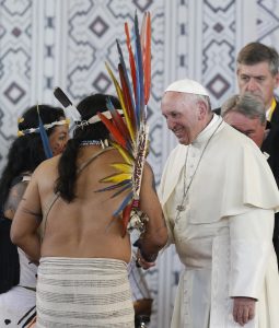 Pope Francis greets members of an indigenous group from the Amazon region during a Jan. 19 meeting at Madre de Dios stadium in Puerto Maldonado, Peru. (CNS photo/Paul Haring) See POPE-AMAZON Jan. 19, 2018.